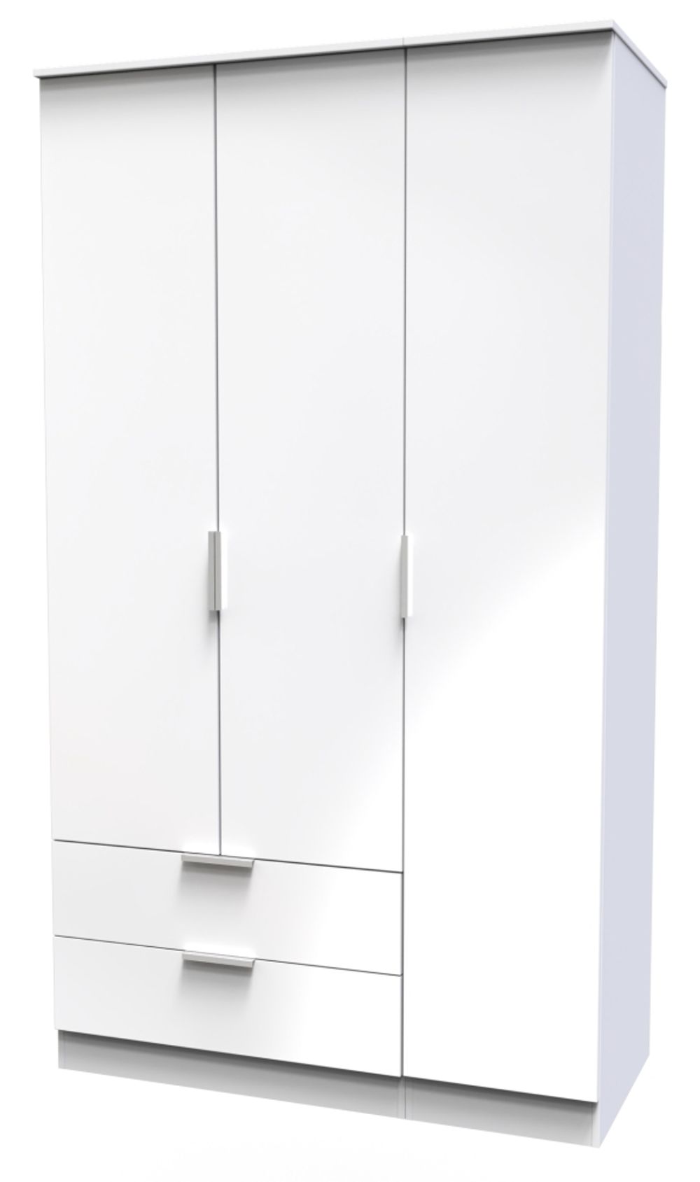 Item Code: PLY141 This wardrobe offers plenty of storage space in an elegant and modern design. It features 3 hinged doors with 2 drawers inside, making it ideal for almost any bedroom. Made from particle wood and with a white gloss finish, this wardrobe looks great in any home. Offering plenty of room to store clothing and other items, this piece is perfect for your home.