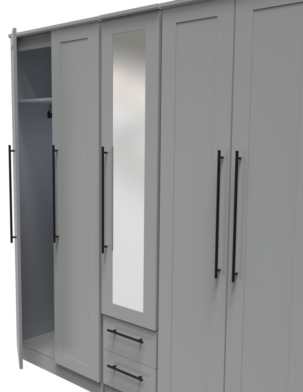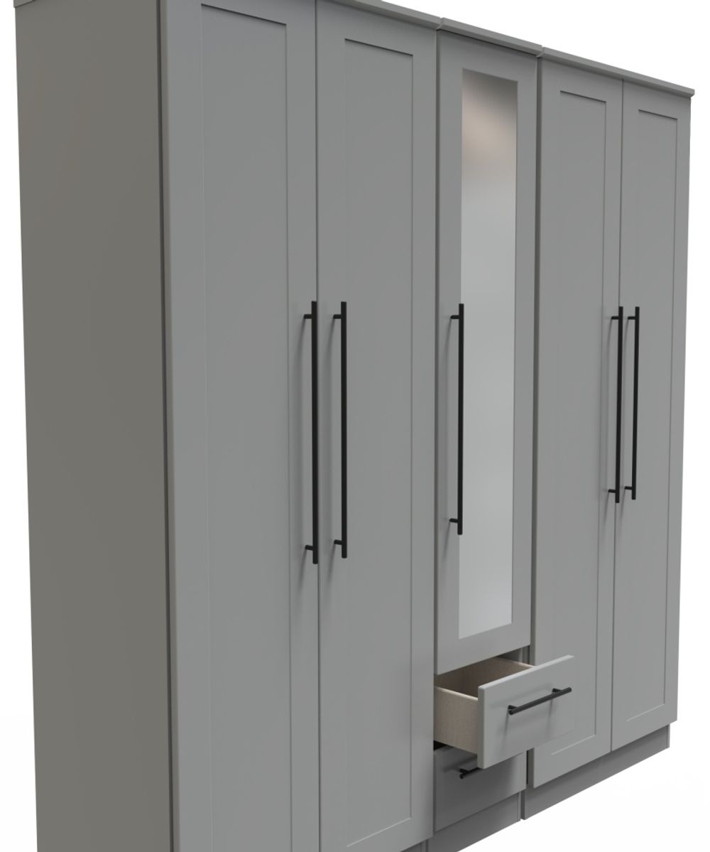 Item Code: BEV191DG This wardrobe is crafted with particle wood for a durable and long-lasting finish. It has a five doors design, with a combination of traditional mirrored doors and practical drawers. The tall stature of the wardrobe makes it ideal for bedroom storage solutions, providing plenty of space for your clothes and accessories. All doors are fitted with handles for easy access. The sleek grey finish of the wardrobe will make it a timeless addition to any bedroom.