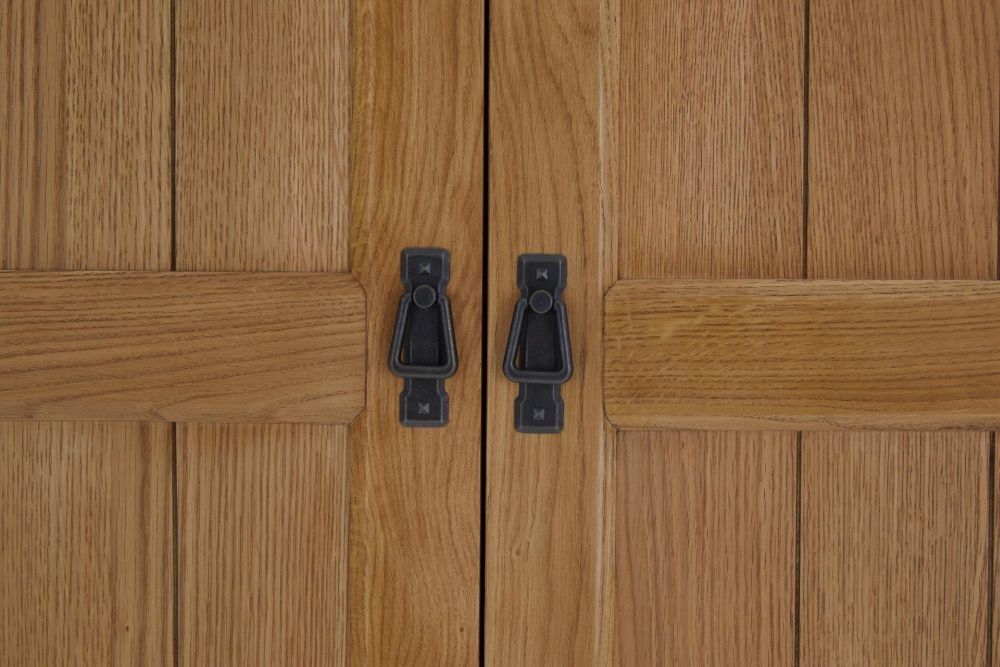 For a personalised finish, choose between antique-style cup pull handles or classic round metal buttons to complement your décor. As part of the Burford Oak Collection, this wardrobe pairs beautifully with matching beds, chests, and bedside cabinets to create a coordinated and timeless bedroom setting.
