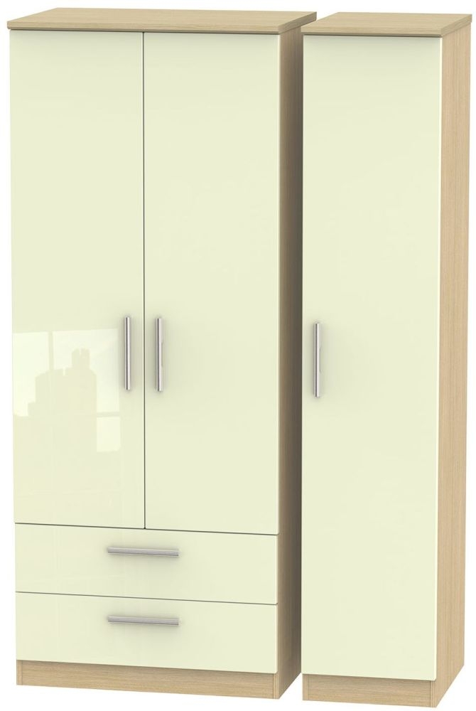 Knightsbridge Cream Gloss and Light Oak 3 Door Triple Wardrobe - LHF 2 Drawers