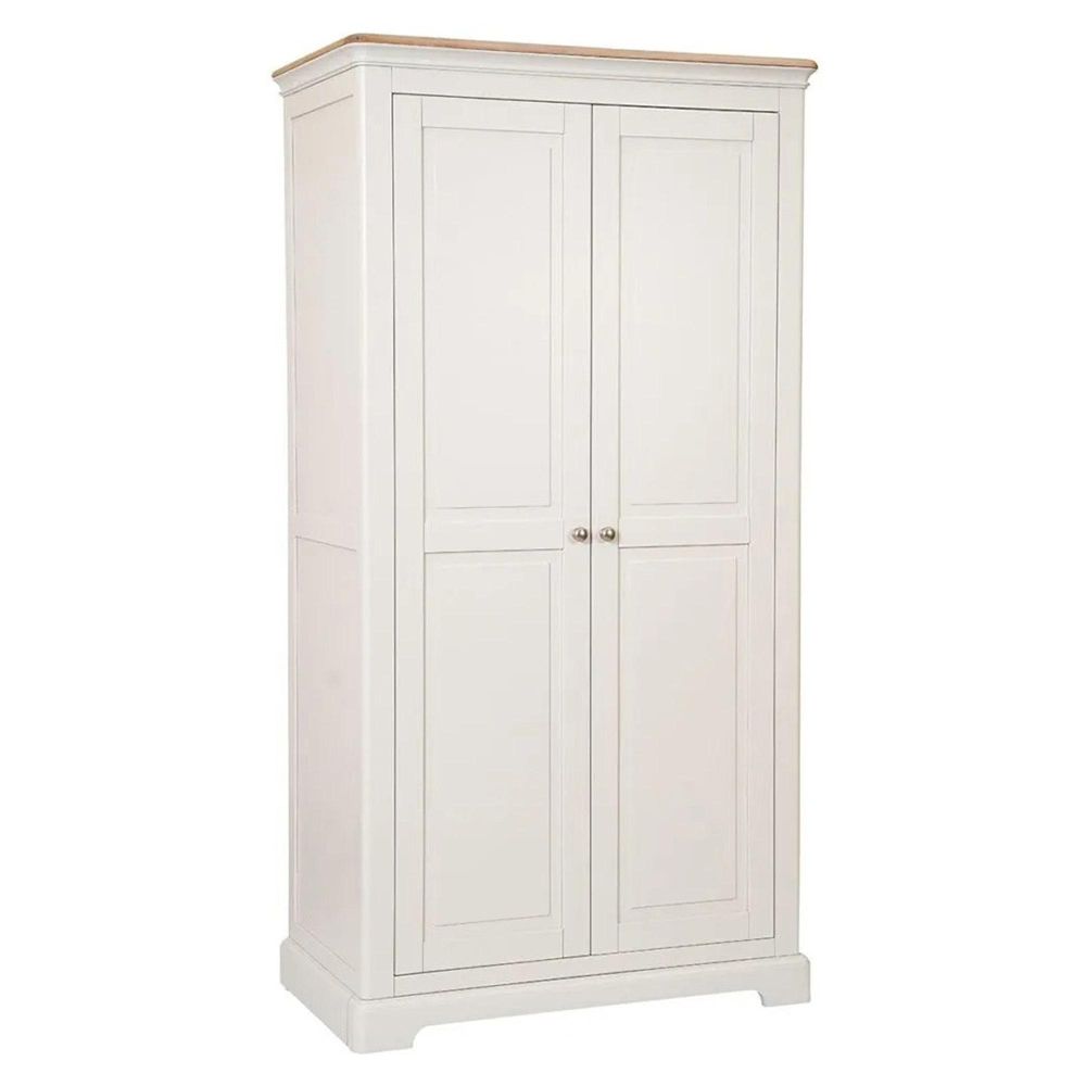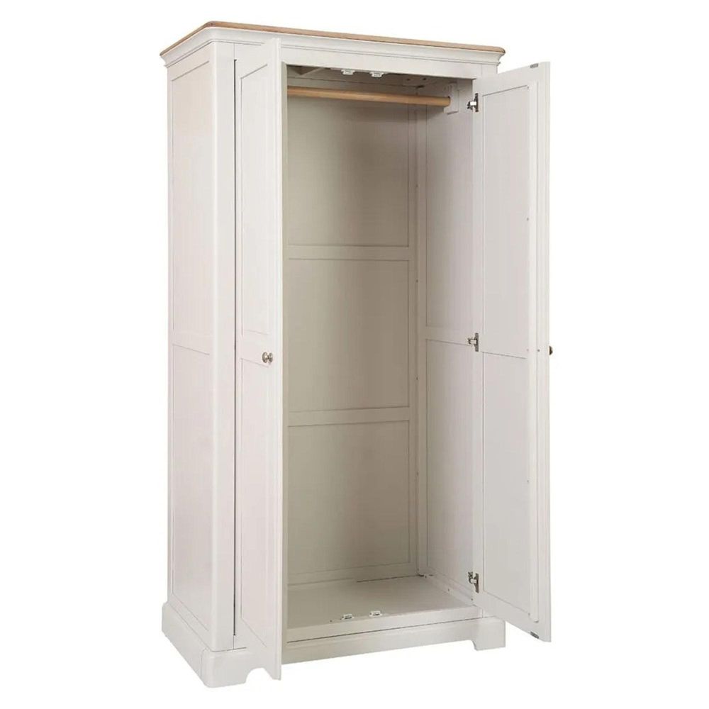 Crafted from a durable blend of oak, pine, and MDF, this wardrobe is built to last. Its light grey painted body is complemented by a lightly lacquered solid oak top, bringing a warm contrast to the calm, neutral finish. The doors are fitted with sleek metal knobs, while subtle moulded detailing adds a refined touch. For extra stability, the wardrobe includes door hinges with foot levellers, making it suitable even for uneven floors.