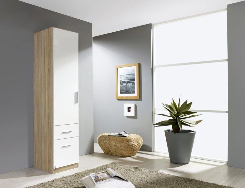Rauch Celle 47cm Sonoma Oak and White Gloss Wardrobe with Drawers - LH Door