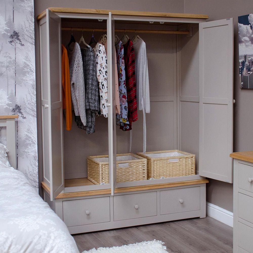 Bring timeless elegance and practical storage into your bedroom with the Diamond Painted 3 Door 3 Drawer Wardrobe. Expertly crafted from solid oak, this wardrobe combines classic design with modern functionality, making it a standout piece in any refined interior. Its grey painted finish highlights the natural grain of the wood, while the lacquered oak top adds a touch of sophistication.