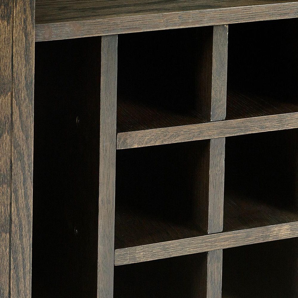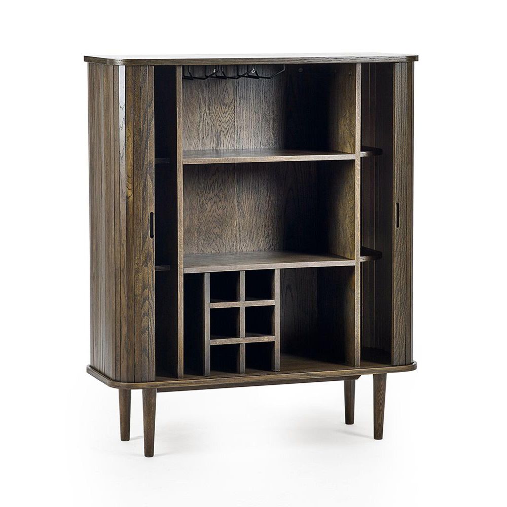 Item Code: ARY007 Add a touch of elegance to your home with the Tambour Drinks Cabinet, designed to keep your favourite wines and accessories organised while you entertain in style. Crafted with a rich dark oak effect, this clean-lined bar cabinet features slatted sliding tambour doors for a modern, sophisticated look. Inside, it offers ample storage with a stemware rack that holds up to four glasses, a wine rack for six standard-sized bottles, and additional shelves for extra essentials. The two cut-out handles and four Nordic-style legs provide a refined, functional touch. Perfect for hosting guests or simply enjoying a quiet drink, bringing both style and organisation to your home. Simple assembly required to prepare it for use without hassle.